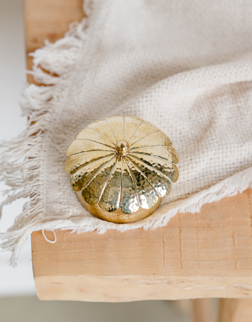 Pour ranger vos bijoux, cette jolie boîte dorée en forme de fleur, conçue par nos soins et réalisée avec talent par nos artisans marocains. On adore son petit couvercle en forme de marguerite, qui apporte une touche délicate et poétique à cet objet. Le laiton est martelé pour accentuer le côté artisanal de cette boîte et lui donner tout son caractère.