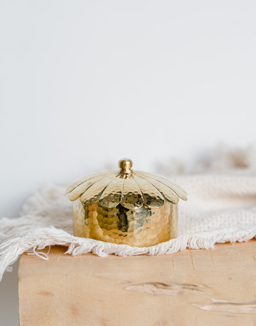 Une délicate boîte dorée en forme de fleur, parfaite pour abriter vos bijoux ou accessoires de papeterie. Conçue par nos soins et fabriquée par nos talentueux artisans au Maroc.