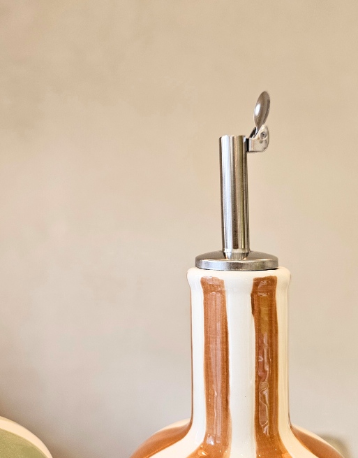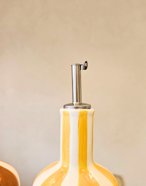 Découvrez ce joli huilier rayé, décliné en quatre coloris harmonieux : jaune, vert, matcha et marron. Son design se distingue par de larges rayures verticales qui lui confèrent du caractère et une élégance intemporelle, tandis que sa forme généreuse et arrondie le rend agréable à utiliser.