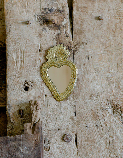 Plusieurs dispositions sont possibles, vous pourrez jouer votre miroir ex-voto seul sur un mur ou en accumulation. Nous pensons notamment à ce cœur martelé ou à ce cœur en laiton qui joueront parfaitement sur les matières et les détails.