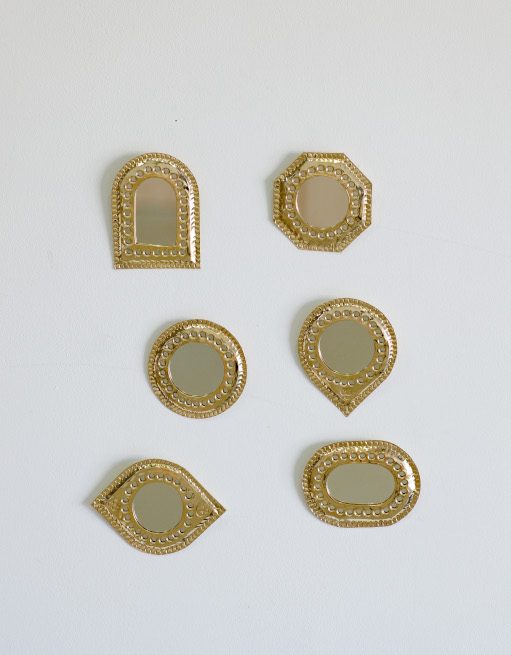 Plusieurs formes sont disponibles, rond, goutte, œil, octogone ou ovale. Fabriqués dans une feuille de laiton puis martelés et cerclés à la main, nos petits miroirs pourront soit habiller un mur existant et se positionner autour de grands miroirs ou de petites décorations en laiton ou pourront soit couvrir un pan de mur en créant une accumulation à l'aide de nos différentes formes et finitions.